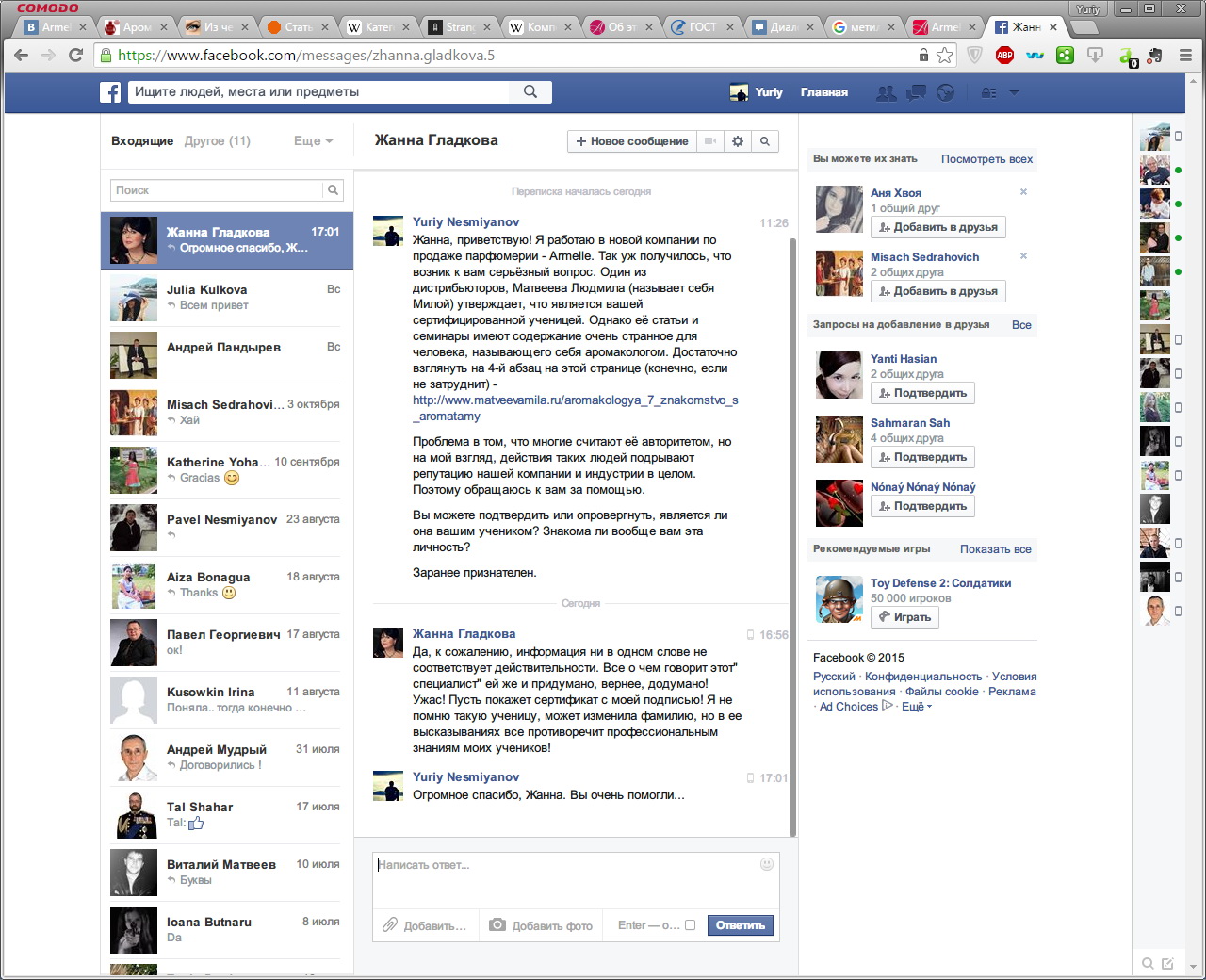 Меня "беспокоит" судьба таких "сертифицированных специалистов"... Задумываются ли они о последствиях, когда без видимых причин, руководствуясь лишь собственным ЭГО, ЧСВ и жаждой признания, нагло врут, прикрываясь именем известного парфюмера? Ниже в спойлере вы сможете сами прочесть ответ Жанны - 100% натуральной Гладковой. Скрин предоставил Юрий Несмиянов.